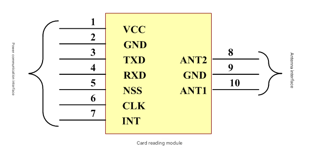 The card reading module has a po♠©≥wer communication in'™terface and an antenna interface, as✘↕γ shown in Figure 3-1. The definition of power communica♦≤↓tion interface for modules₽¥≠ with the same communication m♦♣ethod is the same, and ✘$¶the definition of anΩ$tenna interface for all ant β§enna split modules is als ± o the same.